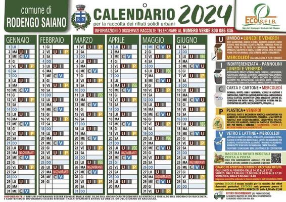 Descrizione È qui visionabile il calendario della raccolta dei rifiuti solidi urbani per l'anno 2024 oppure è scaricabile dal link allegato sotto.