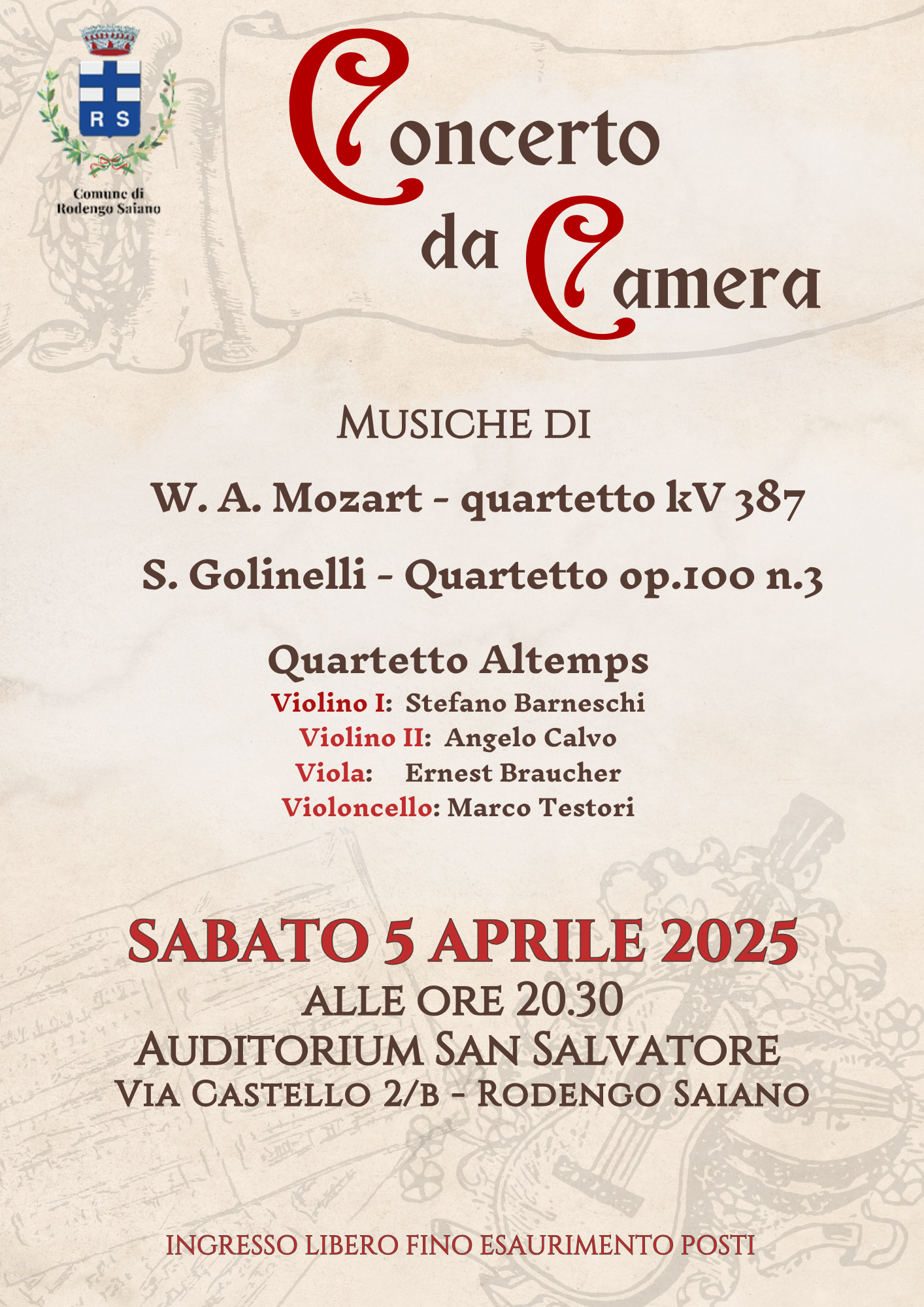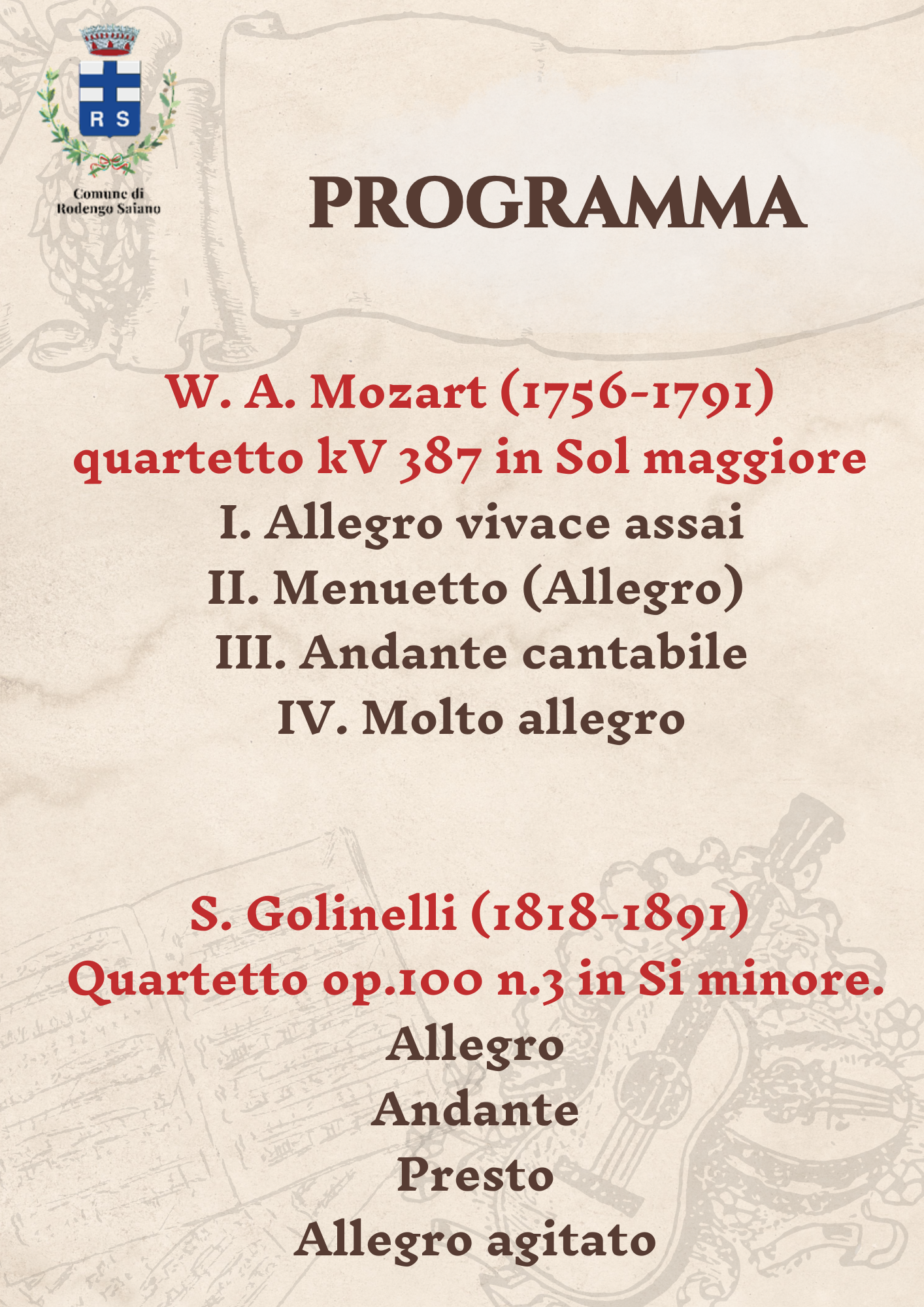 Cos'è Musiche diW. A. Mozart - quartetto kV 387S. Golinelli - Quartetto op.100 n.3Quartetto AltempsViolino I: Stefano BarneschiViolino II: Angelo CalvoViola: Ernest BraucherVioloncello: Marco Testori